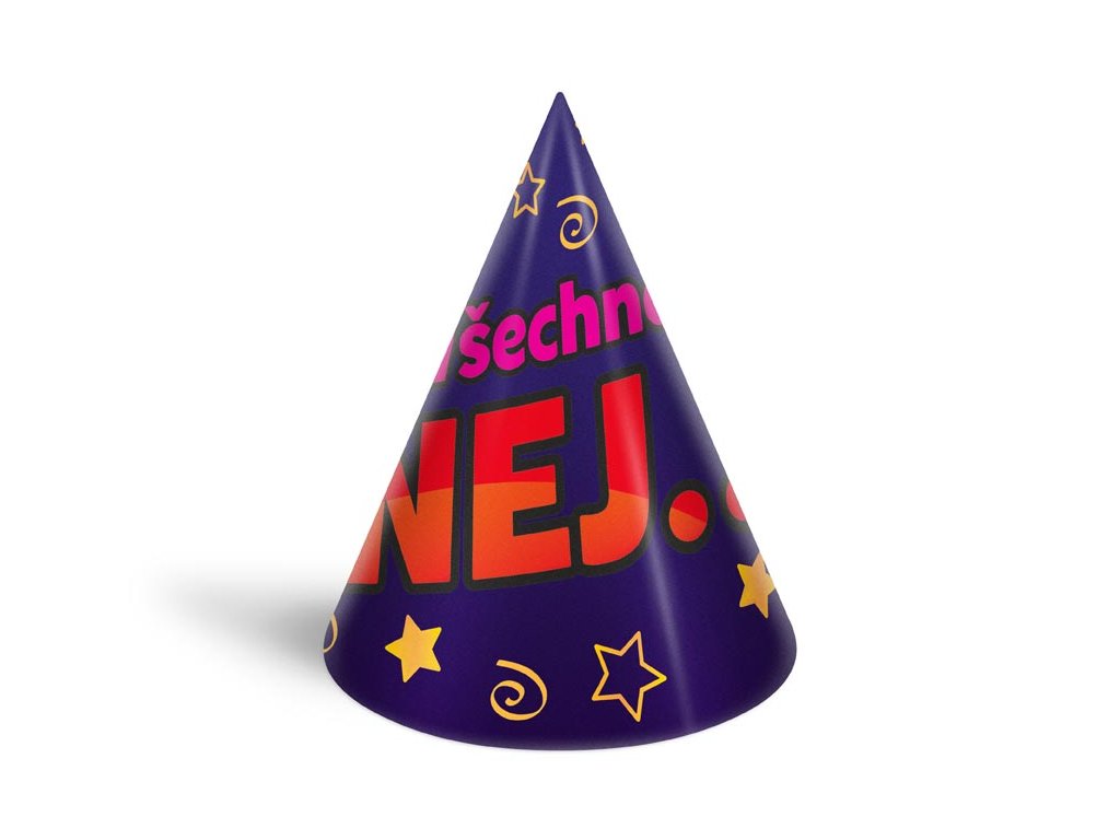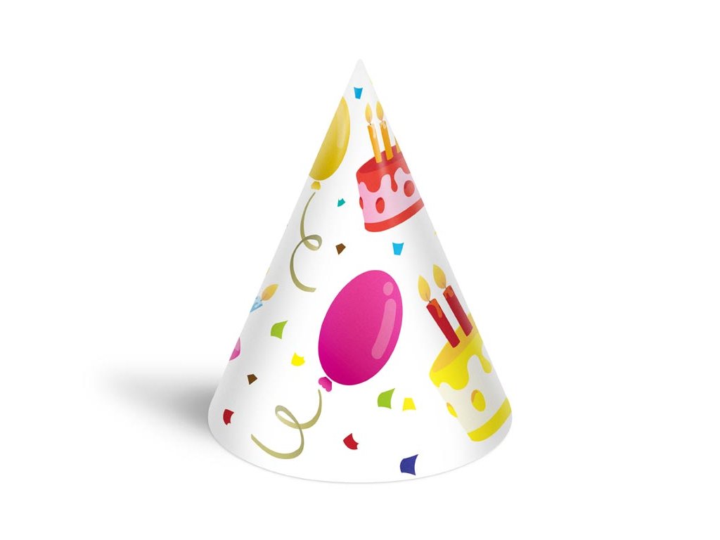 Narozeninový papírový párty klobouček. Karnevalový klobouček velice dobře drží na hlavě, díky kloboukové gumičce, kterou si dáte pod bradu. Udělejte radost oslavenci a uspořádejte velkou párty. Nezapomeňte koupit i frkačky a trumpety.BALENÍ OBSAHUJE: