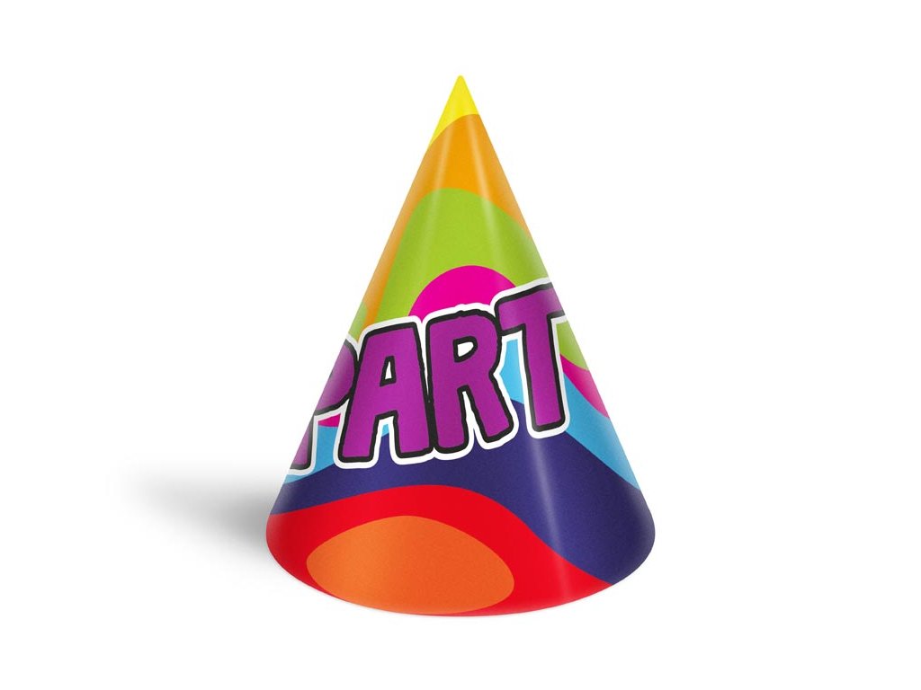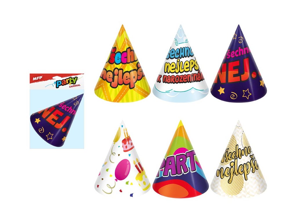 - 6 ks barevných kloboučků s různými párty motivy