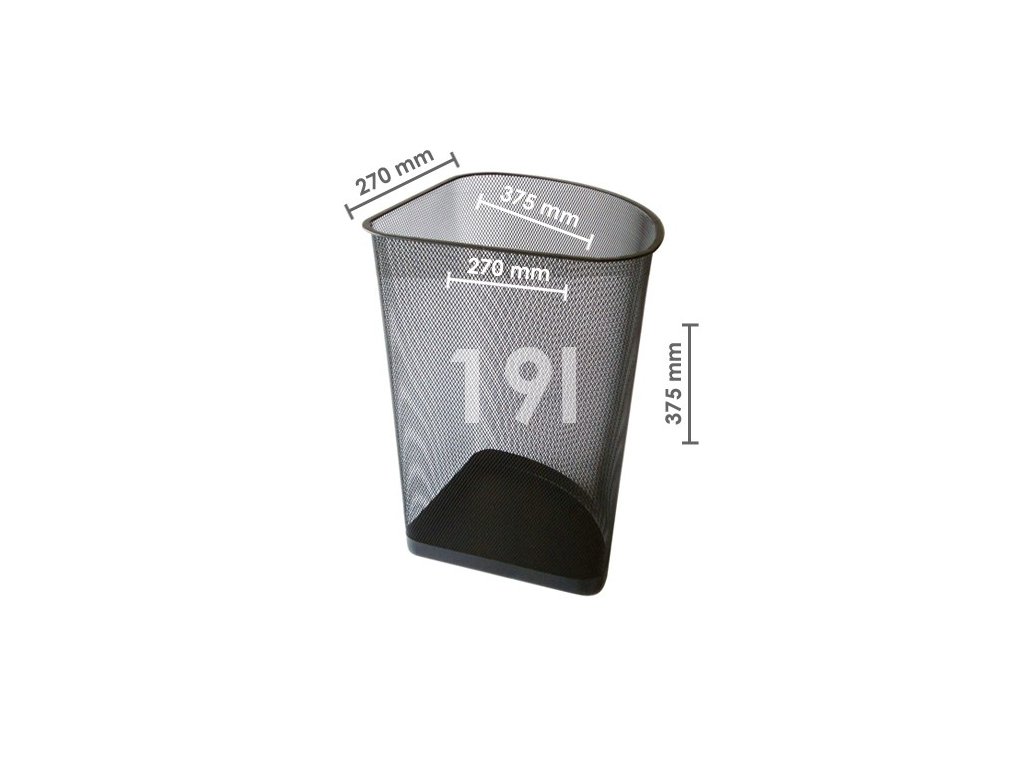 Drátěný rohový koš černý s objemem 19 litrů. Praktický doplněk každé kanceláře nebo studentského pokoje.Doplňkové parametry