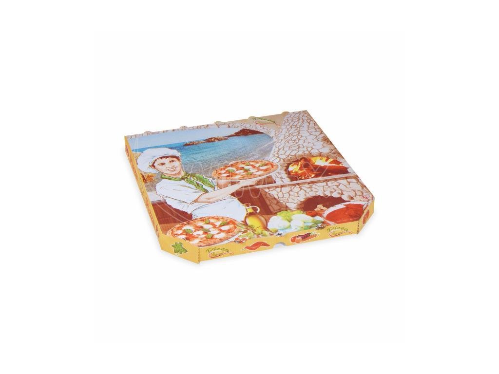 Krabice na pizzu (mikrovlnitá lepenka) E6 bílá s potiskem 33 x 33 x 3 cm [1 ks]