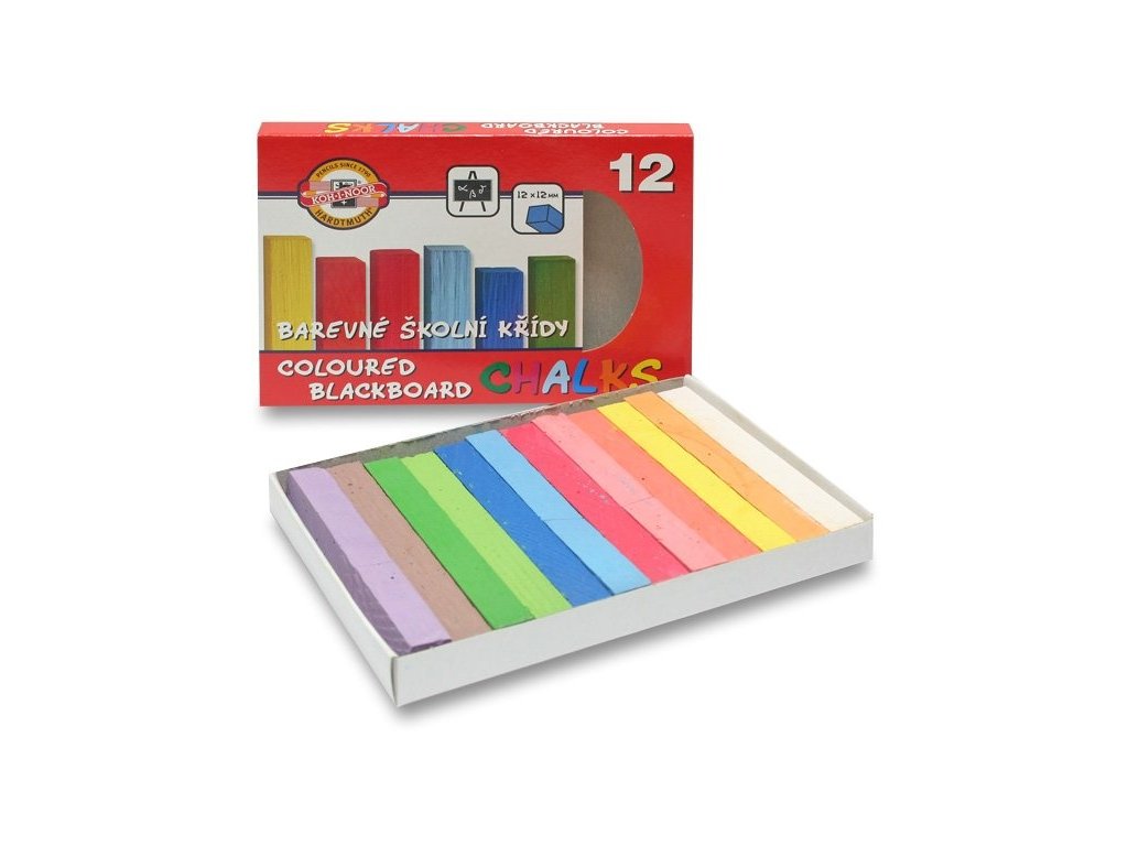 Souprava 12 kusů školních barevných čtyřhranných kříd o rozměrech 12 x 12 x 100 mm, které jsou určeny pro psaní na školní tabule, vložených do krabičky s potištěnou manžetou.Upozornění. Nevhodné pro děti do 3 let. Možnost odlomení malých částí. Nebezpečí zalknutí.