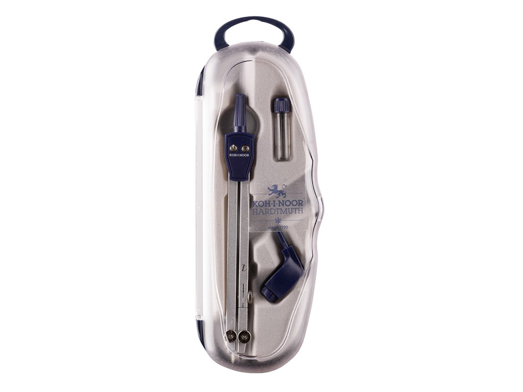 Školní kovové kružítko určené k rýsování kružnic do průměru 360 mm s upínacím průměrem 3,5 mm včetně tuženky s 2 náhradními tuhami a univerzálního nástavce (adaptéru) v krabičce z tvrdého plastu (PS) s eurozávěsem. Dolní část krabičky je tmavě modrá, přední odklápěcí víko je transparentní. Proti náhodnému otevření je krabička kromě zaklapávacího výstupku uprostřed spodního dílu opatřena v místě dotyku horního a dolního dílu rovněž kulatou průhlednou samolepkou..Doplňkové parametry