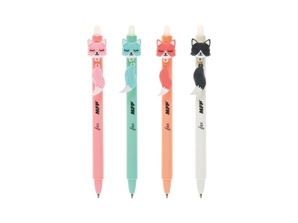 Gumovací, kuličkové pero s liškou obsahuje speciální inkoust tzv. vymaž a přepiš, nebo vymaž a nech znovu objevit. Pokud uděláte chybu, stačí jen otočit pero a plastovou špičkou text vymažete. Špička zahřeje inkoust, ten zmizí a lze je znovu přepsat. Můžete si psát i tajné vzkazy, po vygumování stačí jen papír ochladit pod bod mrazu a text se znovu objeví. Tato vymazatelná propiska je balena v papírovém stojanu po 20 ks.Motiv: liška