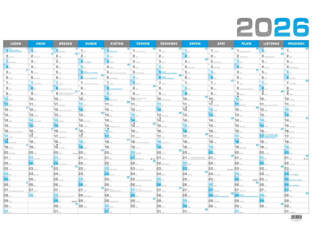 Velký nástěnný kalendář vhodný pro kanceláře a zapisování všech důležitých termínů, laděný do modré barvy.Doplňkové parametry