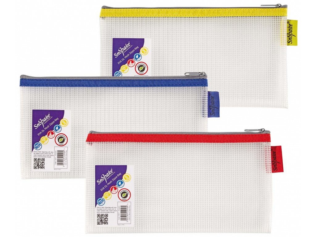 SNOPAKE EVA Mesh, zesílený síťový materiál 0,3 mikrónu, sešité rohy, voděodolný, kovový zip, barevná odlišující páska - červené, modré a žluté provedení, materiál šetrný k životnímu prostředí, rozměry 240x130 mm (šxv), mix barev. Barevnou variantu dodáváme dle skladové zásoby.Doplňkové parametry