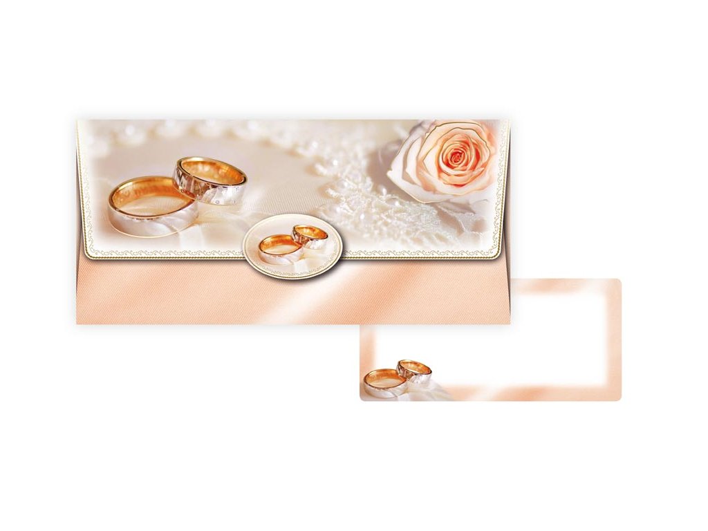 Obálka na peníze svatební prstýnky a růžeTato svatební obálka na peníze v jemně krémových tónech se zlatými prstýnky a růží je stvořená pro slavnostní chvíle. Dodá vašemu daru eleganci, romantiku a decentní symboliku lásky, díky níž se i předání peněz stane krásnou součástí svatebního dne.