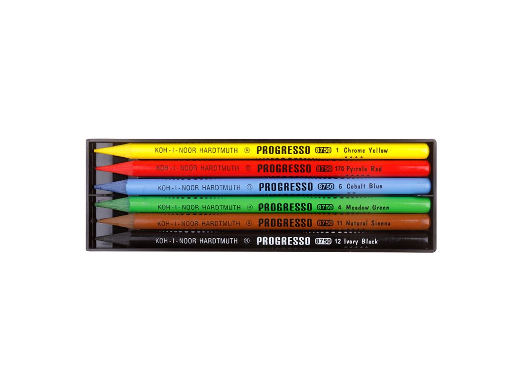 Souprava 6 ks pastelových tužek v laku (PROGRESSO). Jsou bez dřevěného pláště a celý průřez je tvořen z pastelovým jádrem. Pastelky se velice dobře hrotí a jsou určeny pro školní, hobby i umělecké kreslení. Vzhledem k svému průřezu jsou vhodné především pro vybarvování velkých ploch.Doplňkové parametry