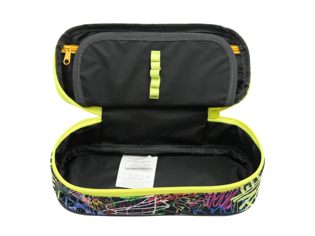Prostorné 1-zipové pouzdro/penál oválného tvaru obsahuje:chlopeň s poutky na pera a tužky (z obou stran 2x 5 poutek)