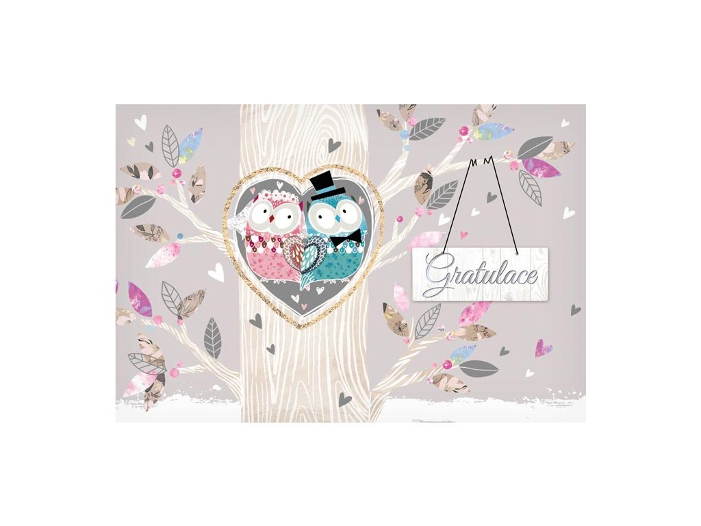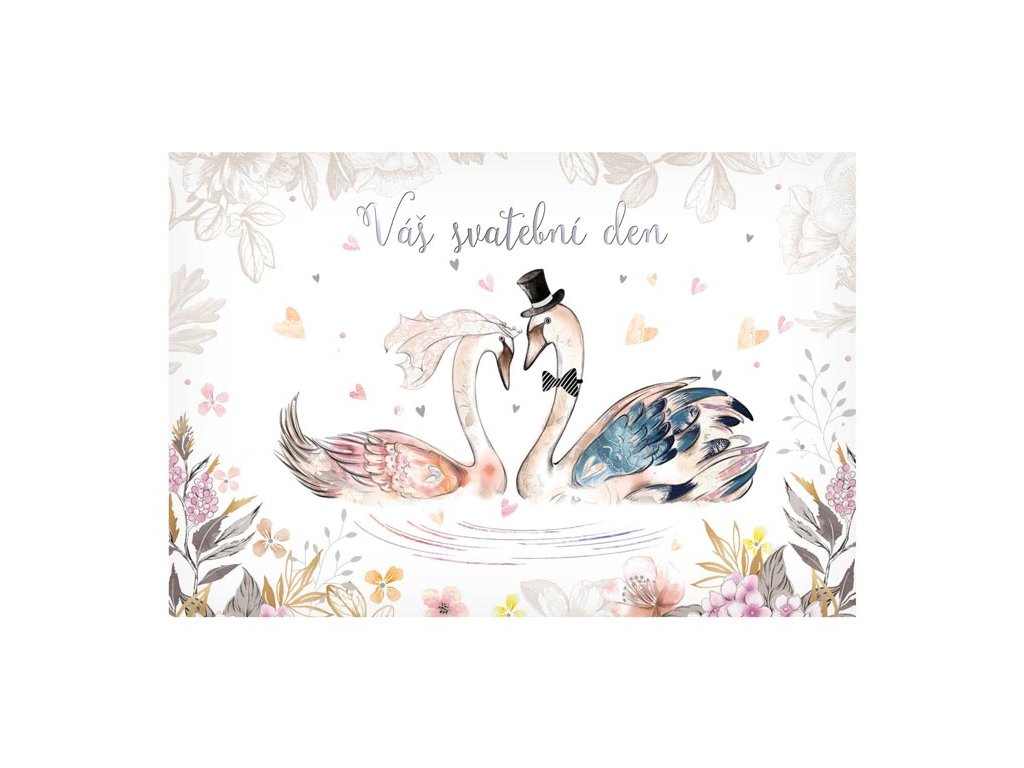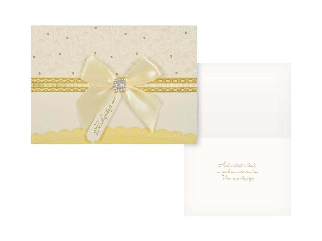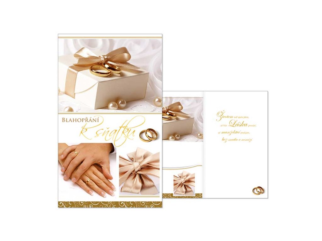 Svatební přání s textem. Svatba je příjemná a mimořádná událost a je začátkem nové etapy života. Mezi svatebními dary by nikdy nemělo chybět i přání novomanželům. Udělejte radost novomanželům a věnujte jim přání k jejich svazku, díky kterému si vždy připomenou krásné začátky jejich manželství. Nápis je vyrytý zlatým písmem a na přání jsou svatební motivy.Text na přední straně přání: