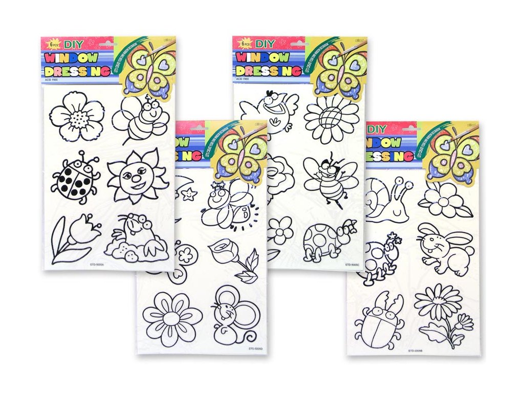 Předkreslené kontury k vybarvení barvičkami na sklo. Udělejte si pohodové odpoledne s dětmi, překreslete si obrázek pomocí těchto šablon, který si pak můžete umístit na Vaše okno.Provedení: zvířátka, květiny