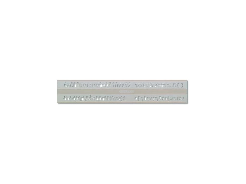 Písmenková šablona vyrobená z kouřového průhledného polystyrenu. Je určena pro práci s technickým perem 0,7 mm. Obsahuje znaky velké a malé abecedy, číslic a matematických znaků. Veškeré znaky jsou velikosti 7 mm a tvaru kolmého písma dle ČSN. Šablona je určena k popisování ve škole i v kanceláři. Zabalena je do celotransparentního polypropylenového pouzdra s papírovou vložkou a eurozávěsem.Doplňkové parametry