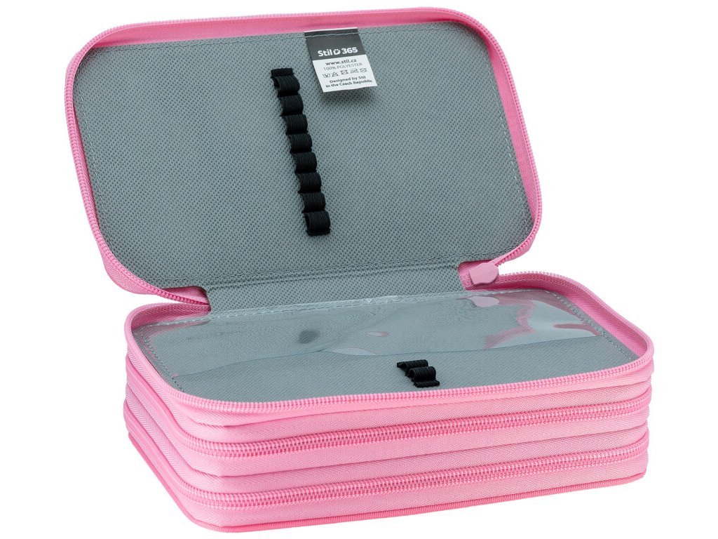 Třípatrové penály pojmou nejvíce psacích a školních potřeb.První patro obsahuje 8 gumiček na pastelky, 2 gumičky na tužky a jednu větší na pero, gumičky ořezávátko i gumu a malou uzavíratelnou kapsičku na drobnosti.