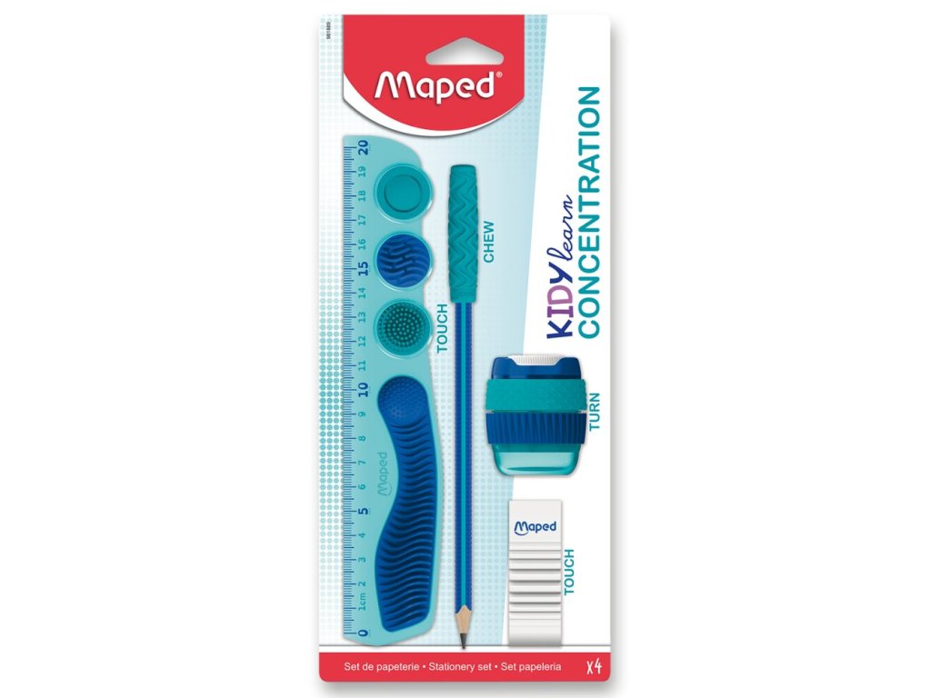 Sada 4 kusů školních potřeb Maped Kidy Learn. Kolekce Kidy Learn Concentration je určena ke zlepšení koncentrace, zamezení rozptylování a snížení úzkosti a stresu tím, že nabízí uklidňující způsob seberegulace. Opakující se pohyby spojené s používáním školních pomůcek mohou stimulovat mozek a povzbudit kreativní myšlení.Sada obsahuje: