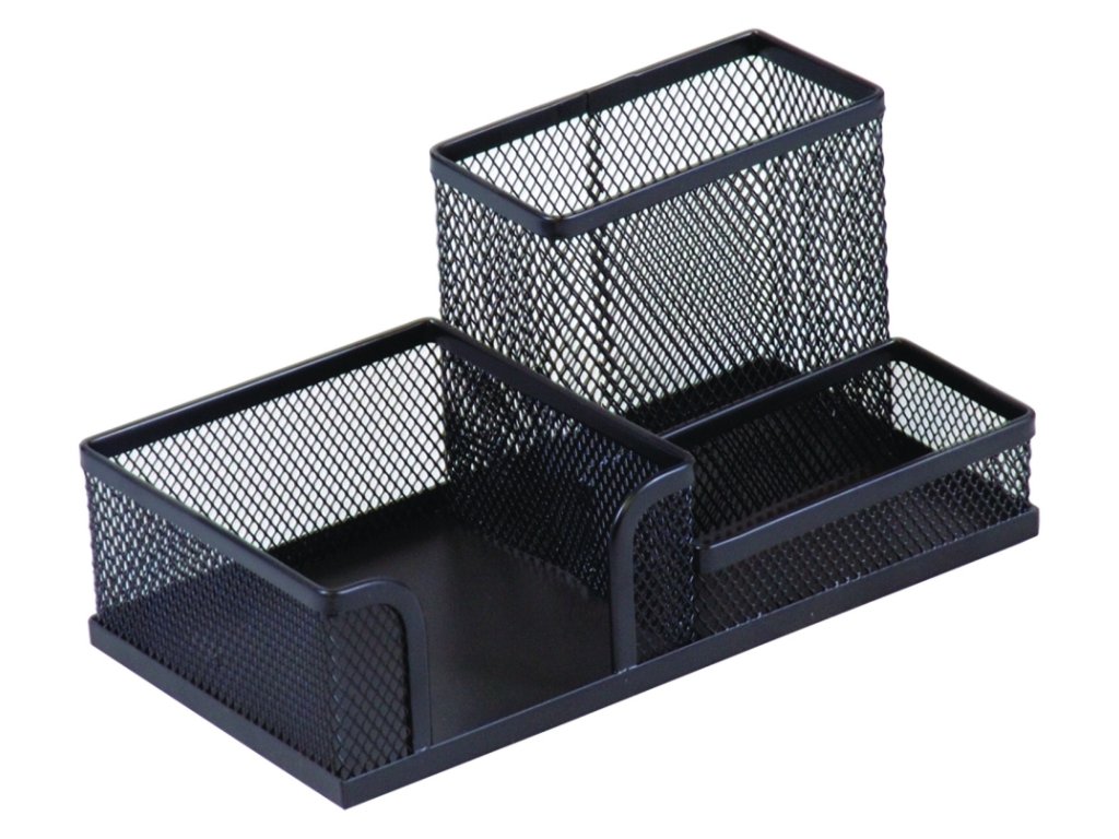 Univerzální kovový organizér je elegantním doplňkem do kanceláře a home office. Zásobníky na psací potřeby, poznámkové papíry (95 x 95 mm) a drobné kancelářské potřeby (spony, klipy, příp. vizitky). Dno zásobníku s protiskluzovými podložkami.rozměry: 205 x 103 x 98 mm