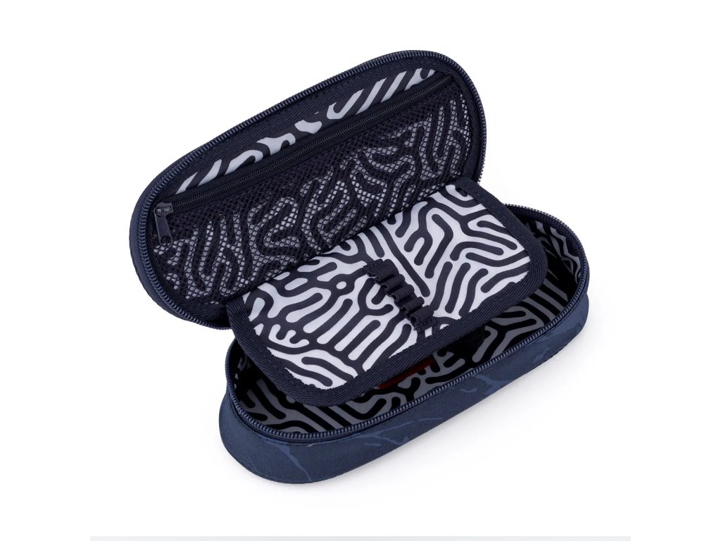 Polstrované pouzdro pro studenty i školáky.Oválný penál pro všechny starší školáky a studenty. Uvnitř pouzdra je síťová kapsička na zip a klopa s devíti gumičkami na propisky. Volný prostor pod klopou slouží pro další psací potřeby – pastelky, fixy, ale i pravítko nebo kružítko.