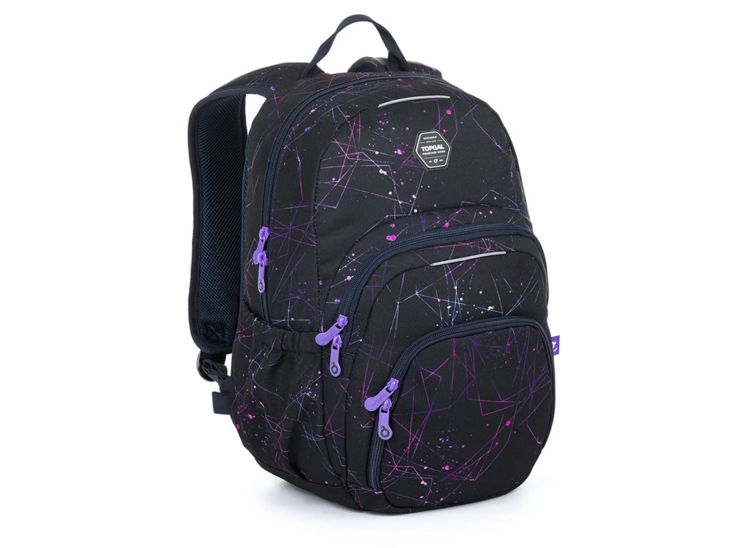 Objemný studentský batoh se díky černému základu hodí ke každému oblečení. Padne na záda všem slečnám s výškou od 145 cm.Jednokomorový batoh s fialovými detaily nepokazí žádný outfit. Záda batohu jsou polstrovaná, anatomicky tvarovaná a pevná díky lehké hliníkové výztuze. Uvnitř zadní komory je umístěna polstrovaná kapsa na notebook i tablet.