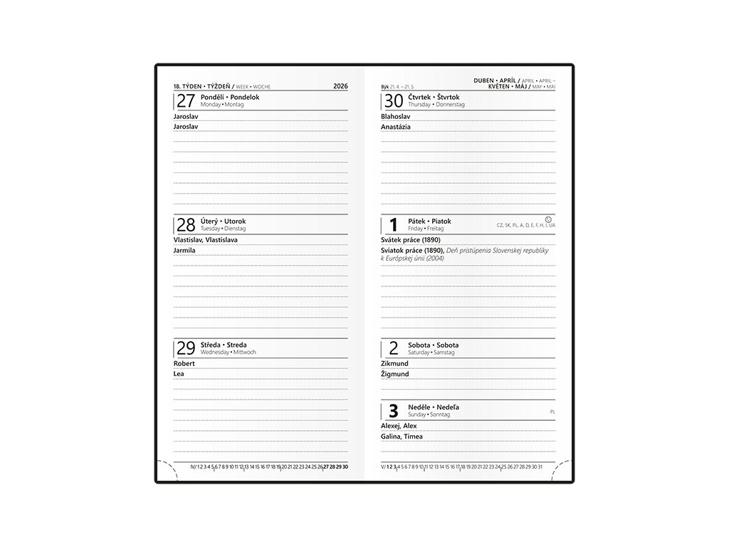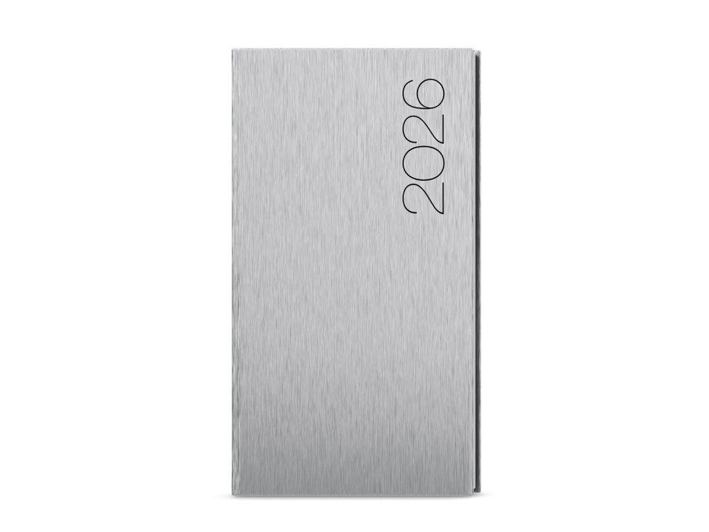 Kapesní týdenní diář v lesklé stříbrné barvě se strukturovaným povrchem. Moderní doplněk do každé kapsy. Diář má velký prostor pro poznámky a plánování.Kalendárium: Týdenní