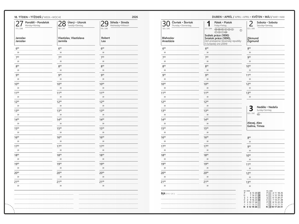 Týdenní diář ve formátu A4 v jednoduchém stylu a v hladkém provedení. Skvělý formát diáře Vám usnadní naplánovat jakékoli schůzky a úkoly na celý týden.Doplňkové parametry