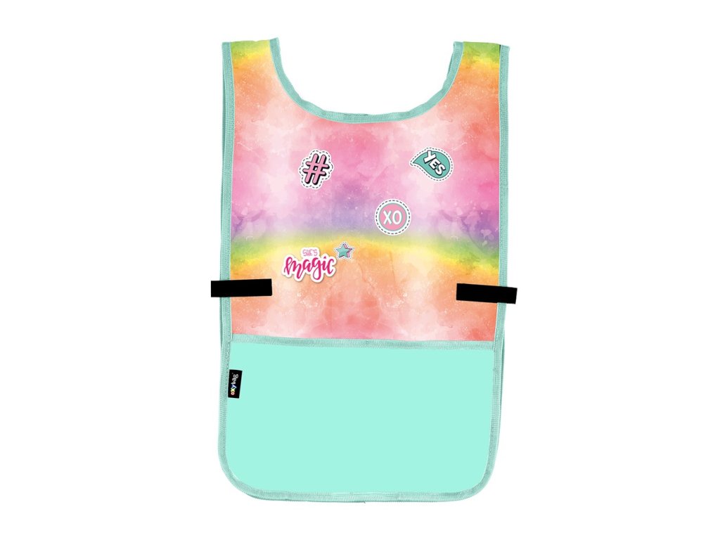 Zástěra pončo do výtvarné výchovy či na jiné tvořící aktivity. Oblékání přes hlavu, po stranách zapínání na druk. Vpředu jedna prostorná kapsa. Materiál 100% polyester.